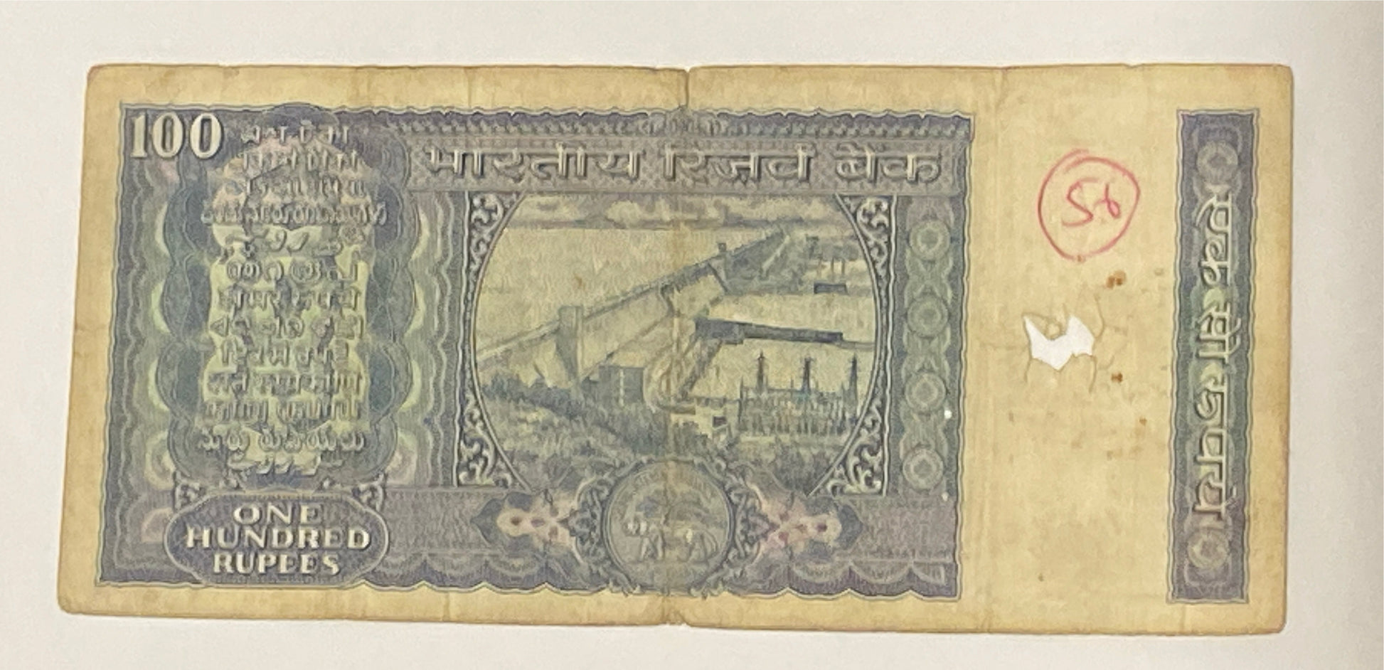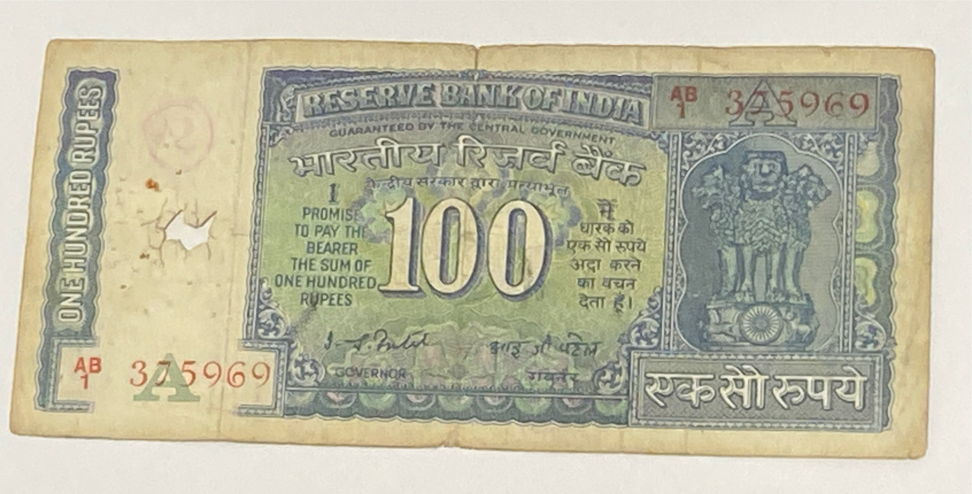 Circa 1970 RESERVE BANK OF INDIA 100 RUPEE BANKNOTE AB1 375969